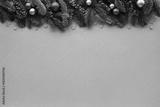 Christmas background for festive greeting card with fir branches, red berries and shiny decorations on beige table top view.