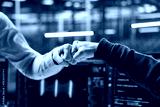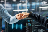 Close up of admins doing fist bump in data center after successfully optimizing performance with AI assistant. Data center IT experts celebrating good results, speeding up tasks with LLM chatbot