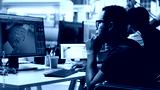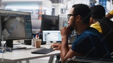 African american wheelchair user testing CAD software for manufacturing solar panels, factory engineer working in solar energy industry. Specialist with disability at the job. Camera A.