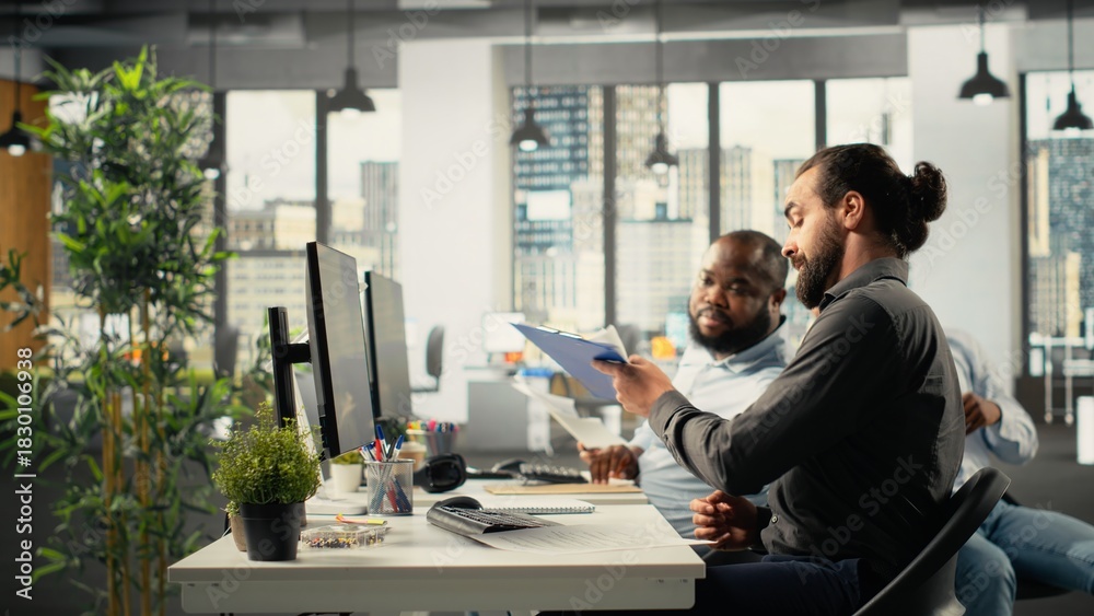 Business staff in modern office sharing insights and reports with colleagues, team focuses on data visualization for efficient resource allocation. Company administration at workplace.