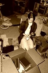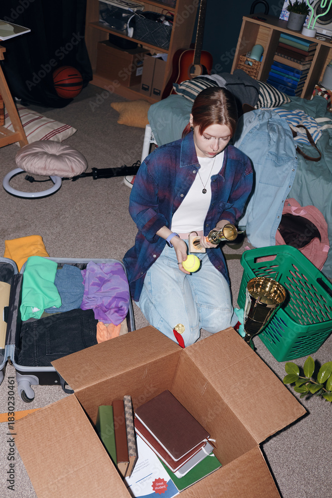 Caucasian teenage girl sitting on floor packing suitcase and cardboard box with clothes, books, trophies and diploma, surrounded by laundry basket and personal belongings in messy bedroom