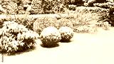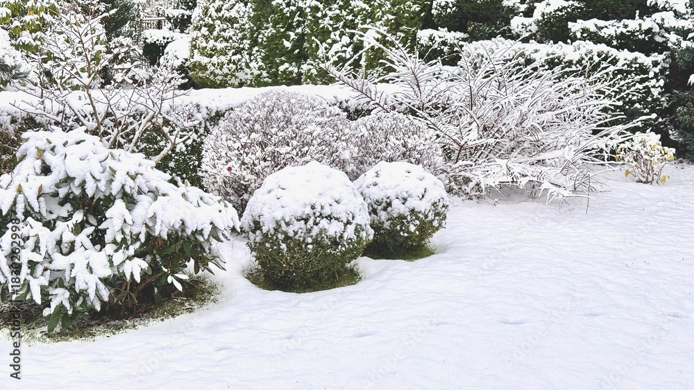Winter garden transforming with fresh snow, covering green bushes and bare branches in a cold landscape background
