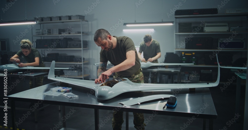 Synchronized Drone Production Team Simultaneously Assembling Large UAV. Technicians in Uniform Simultaneously Assembling UAV Workstations. Concept of Efficiency in Modern Defense Production.