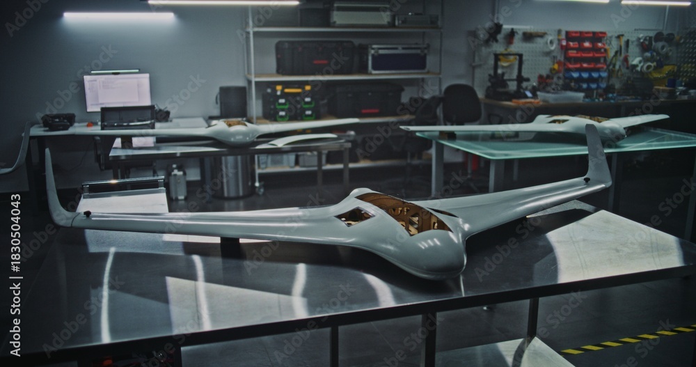 Close Up of Internal Look Large Unmanned Aerial Vehicle With Open Hatch Revealing Its Internal Electronic Components and Wiring. Concept of Complexity and Technology Built Into Modern Defense UAV.