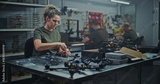 Military Grade Drone Assembly By Focused Female Defense Worker. Woman Assembling Military Grade FPV Drones. Concept of Refining Drones, Facility Dedicated Defense Technology and Security Innovation.