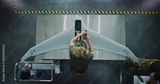 Woman in Camouflage Uniform Working on Next Generation Drone. Female Soldier Installing Electronic Parts Into Surveillance Drone. Concept of Advanced Military Research and Development. Top View.