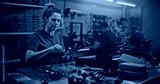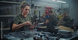 Female Technician Engaged in Hands on Assembly of Modern FPV Quadcopter, Connecting Small Parts Frame. Concept Meticulous Production Process and Quality Control in Professional Tech Facility.