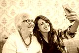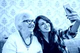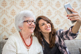 Smiling grandmother and granddaughter taking selfie photo on smart phone.