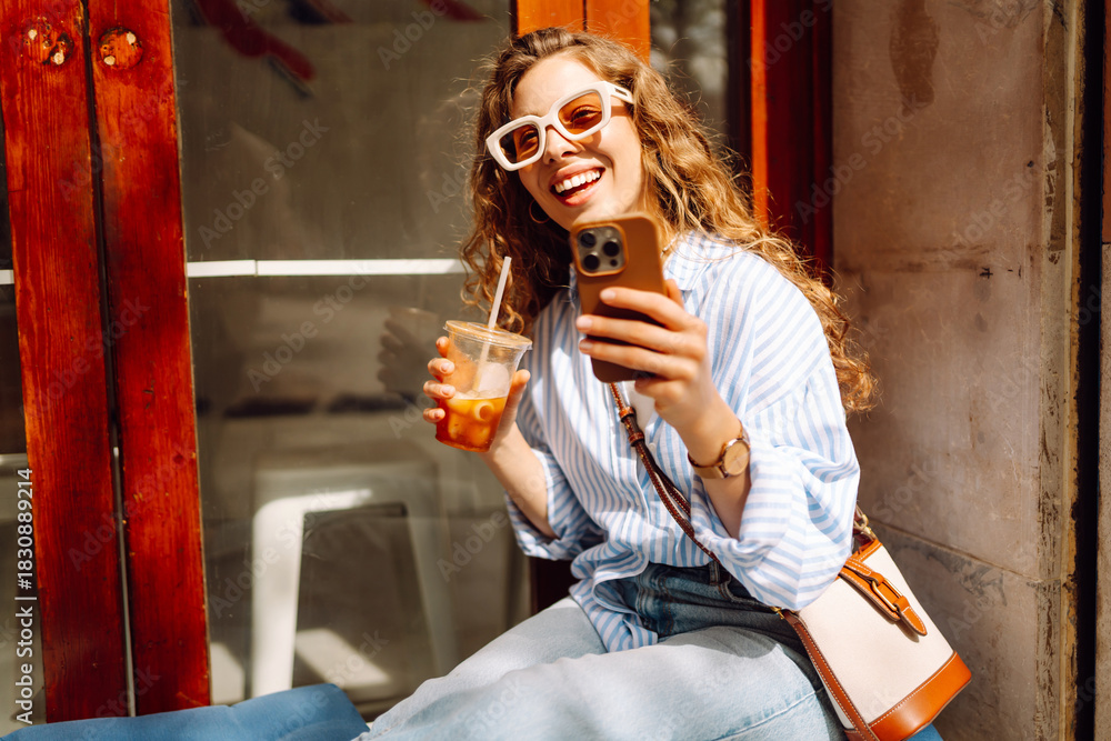 A smiling woman in stylish clothes sits with a cold drink on a bench near a coffee shop. A young woman enjoys a sunny day with a drink and a phone in hand. Concept: drinks, relaxation.