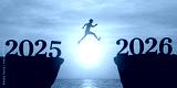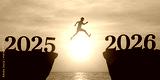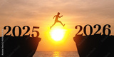 New Year 2026, Inspiration and progress towards new success. silhouette of a people jumping out off a cliff with the number 2025, heading towards the number 2026. new year goals and challenge concept