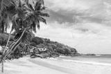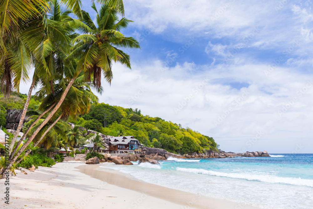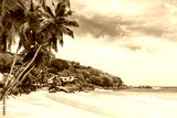 Sunlit tropical beach with swaying palm trees, white sand, turquoise waves,