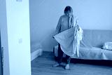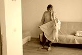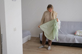 A woman stands in a minimalistic room, examining a light green shirt as she prepares for her day. Soft light illuminates the space