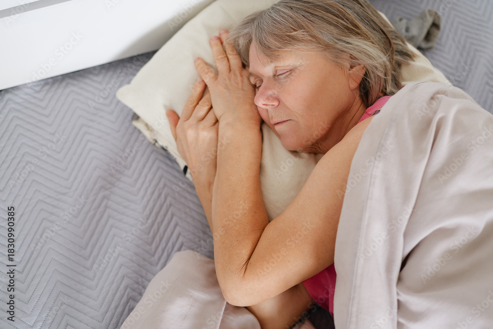 A woman with gray hair sleeps soundly on a comfortable bed, surrounded by soft bedding in a serene bedroom. The morning light gently illuminates the room