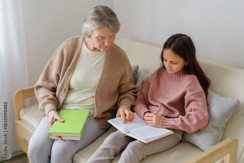 In a bright living room, a grandmother and her granddaughter enjoy a peaceful reading session on a comfortable sofa, with books in hand and sunlight pouring in