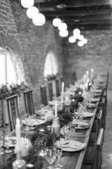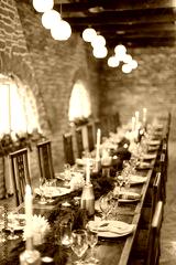 illumination, wedding, celebration concept. in the light of numerous lamps and candles there is a long table prepared for celebrating day x in life of two lovers