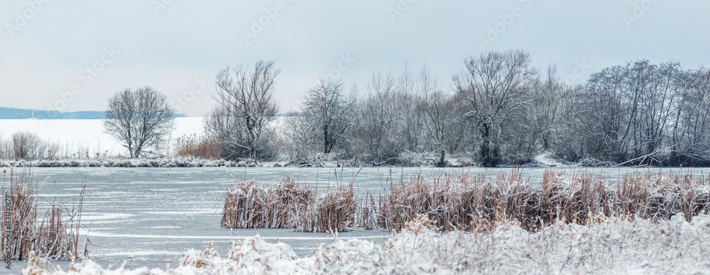 Panoramic winter landscape with a partially frozen and snow-covered reservoir framed by bare trees, shrubs and reeds against the background of a white snowy field and sky