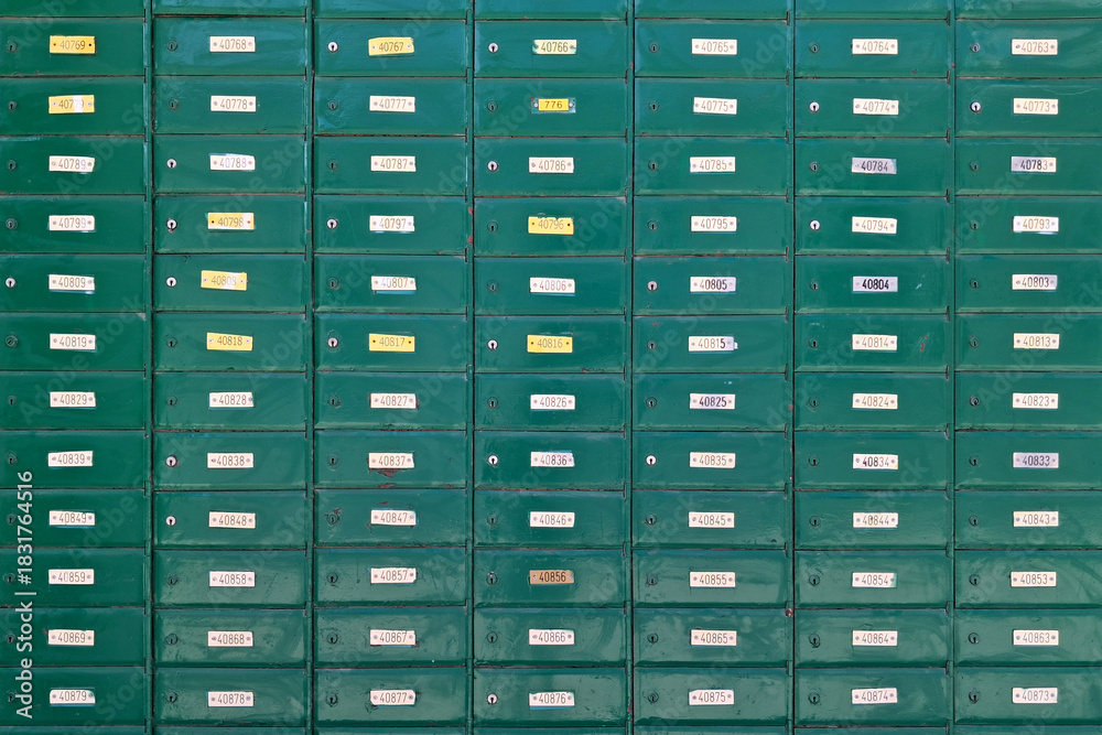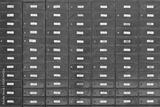 Wall of mail boxes outside a post office