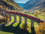 Aerial drone view of the red Bernina Express train crossing the Brusio Viaduct in Switzerland on sunny autumn day, colorful trees, alpine village in mountain valley scenery. Top view of train in Alps
