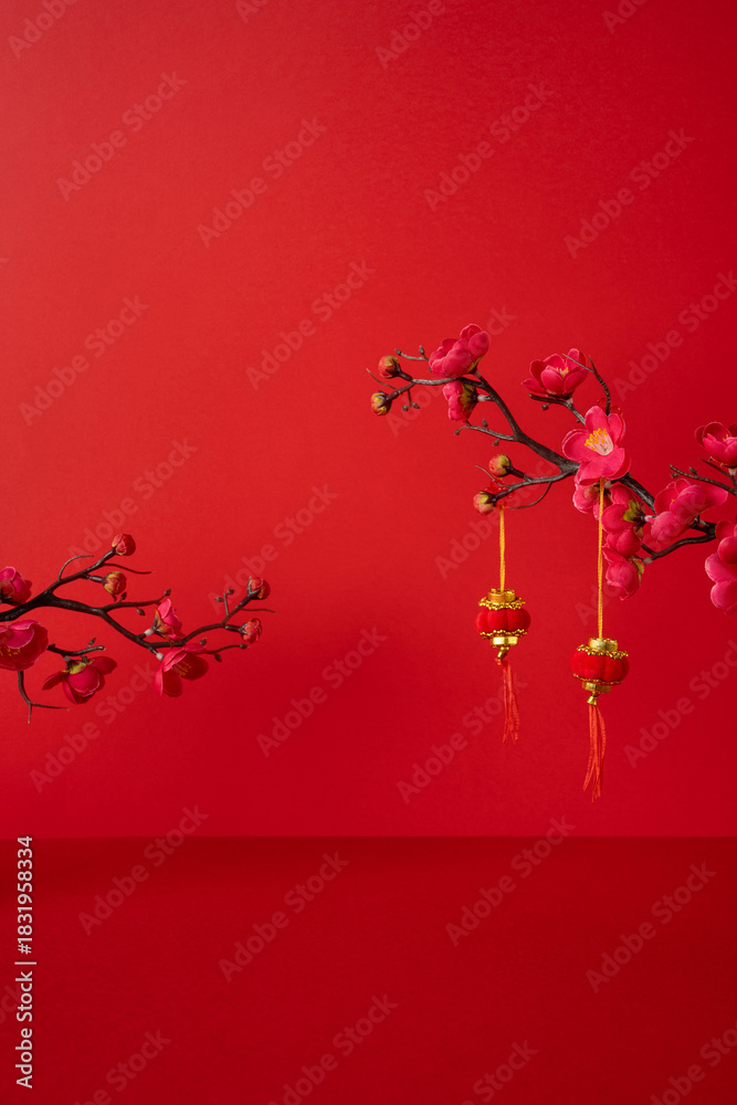 Side vertical view of a festive red backdrop with pink blossoms and gold lanterns, conveying Chinese New Year celebration and warm greeting for prosperity and luck