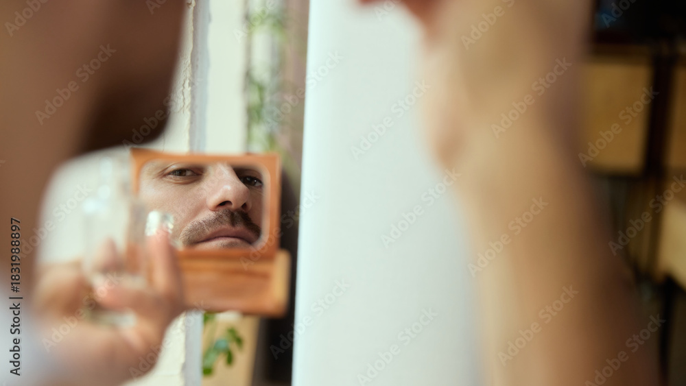 Man examining face in small mirror with concentrated expression. Concept of grooming tutorials, men lifestyle media, skincare diagnostics and accuracy in self-care routines.