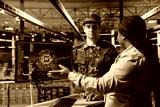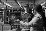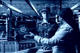 Server farm workers interpreting artificial intelligence systems output during mission planning. Army tech expert in data center coordinating efforts with commander, using AI tools