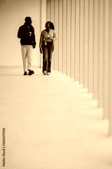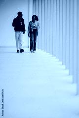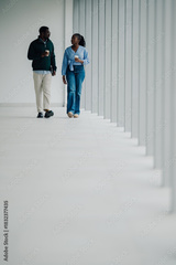 Couple walking and talking in hallway drinking coffee