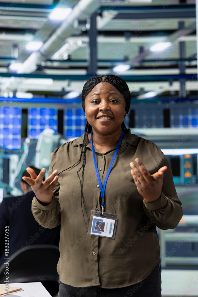 Solar tech consultant ensuring a discussion about solar power production, briefing the employees to guarantee renewable energy efficiency. Business consultant in a manufacturing plant.