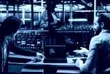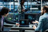 Programmers doing brainstorming in data center, using AI LLM assistant to do maintenance on equipment rigs. Server hub admins working together, using large language model chatbot to do backups