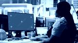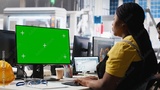 Photovoltaics facility worker reviews data on green screen computer to improve production, eco friendly solar energy. Solar panels plant expert identifying system errors using mockup PC. Camera A.