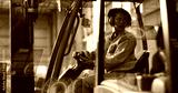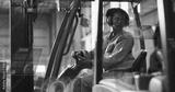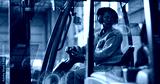 Operating forklift, woman wearing orange vest and red earmuffs steering in warehouse, holograms