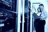 Team of technicians working together on servers at the data centre
