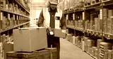 Scanning worker wearing hi-vis vest and cap, operating scanner in warehouse, with pallets