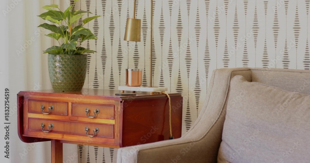 Wooden side table showing green planter, brass lamp, notebook with cable in lounge nook, copy space