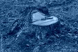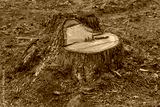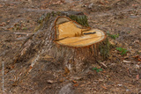 Pine tree forestry exploitation in Carpathian mountain in Romania. Pine stump, result of tree felling. Total deforestation area, cut forest. swawn trunk