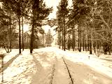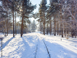Winter landscape scenery with country road through the snow-covered fields, rural area.