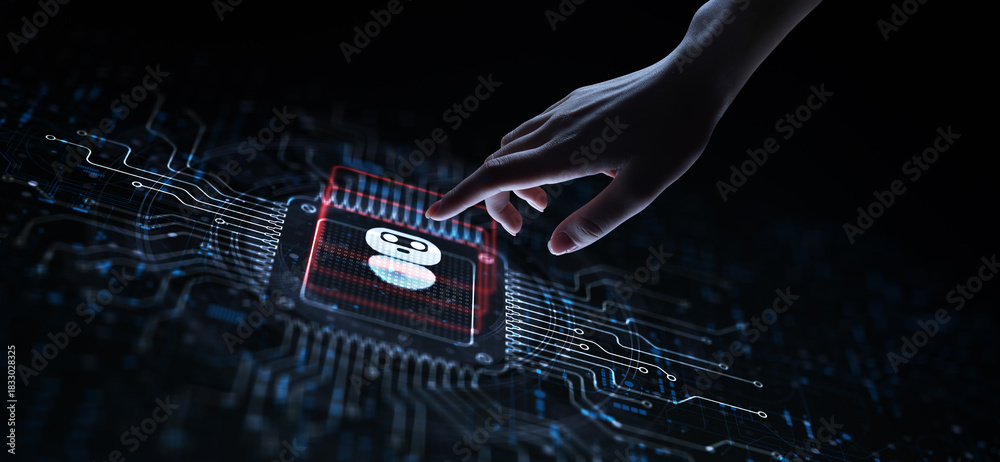 Chat Bot Automating Customer Interactions Illustrated on a Processor Touched by a Human Hand.