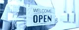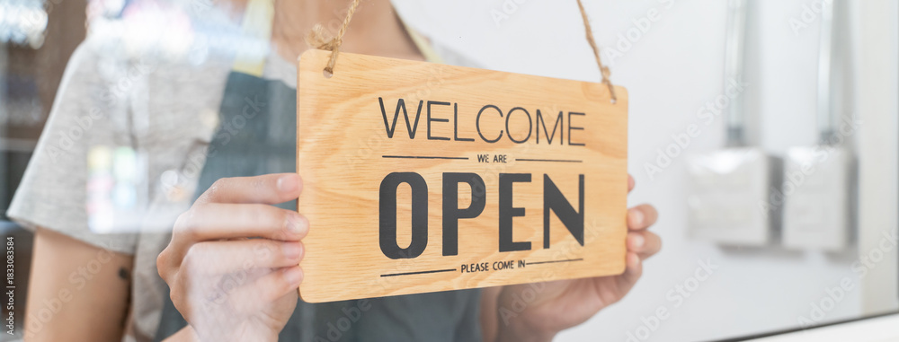business retail owner hanging close wooden sign board at the entrance door of the shop and ready to service customer. Selective focus on sign board.