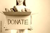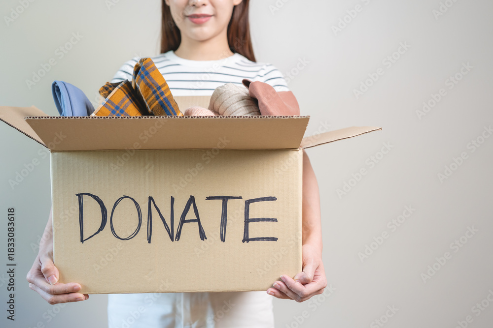 person separate clothes for donation into boxes and wait to give to volunteer charity to share to another people.