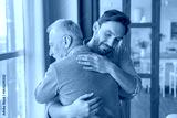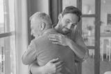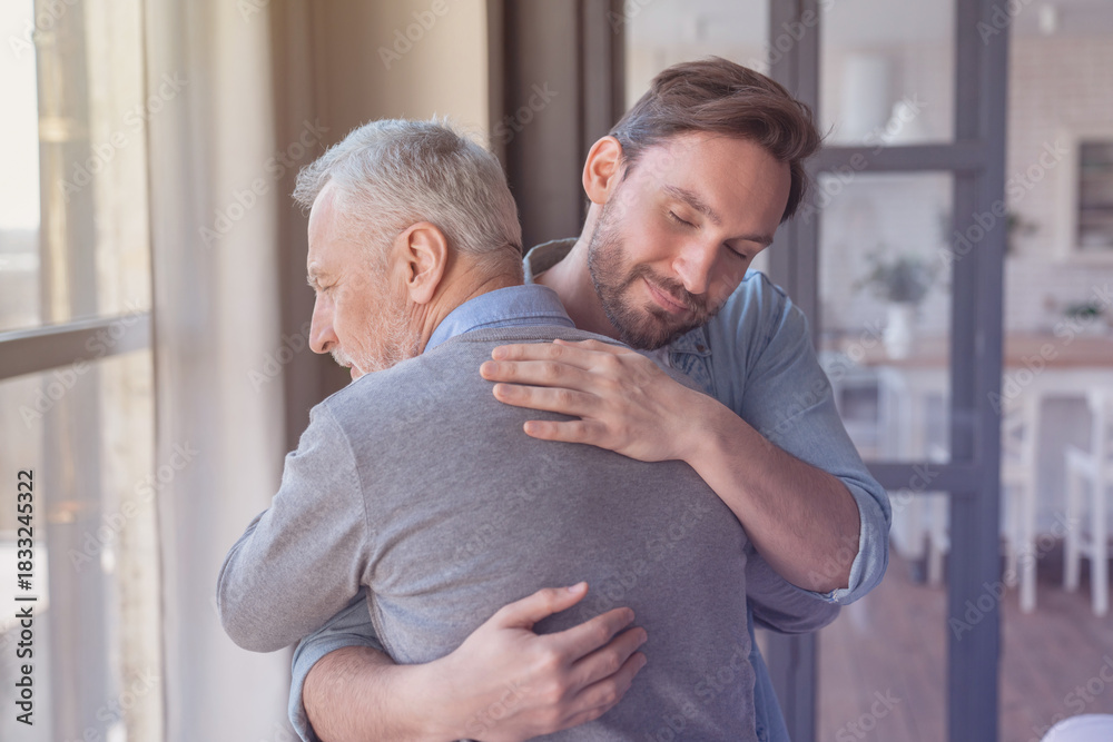 Caring cute caucasian adult son hugging embracing his old elderly senior father showing him love and support. Family time, happy father`s day! I love you, dad!