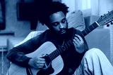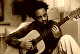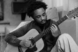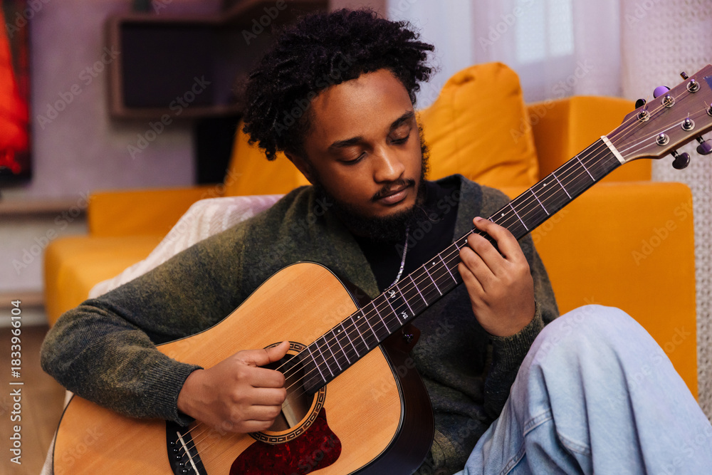 A male musician sits and plays the guitar, looking at it while leaning on a sofa