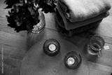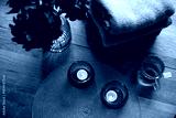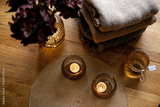 Home interior decor in brown colors: glass vase with dried flowers, candles and cup of warm tea