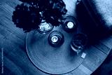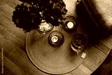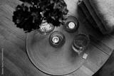 Home interior decor in brown colors: glass vase with dried flowers, candles and cup of warm tea