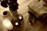 Home interior decor in brown colors: glass vase with dried flowers, candles and cup of warm tea