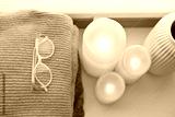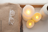 Pile of warm knitted sweaters, led battery candles and vase over white background with soft window light.