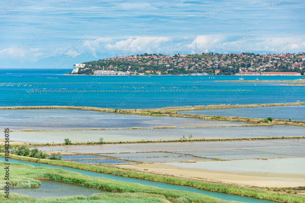 Salt Springs, a nature park in Secovlje, Slovenia, overlooking the coastal town of Portoroz, seen from the bike path on the Croatian side on a sunny summer day.