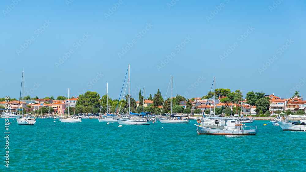 A small bay with moored boats in the Croatian town of Umag, viewed from the promenade on a sunny summer day.