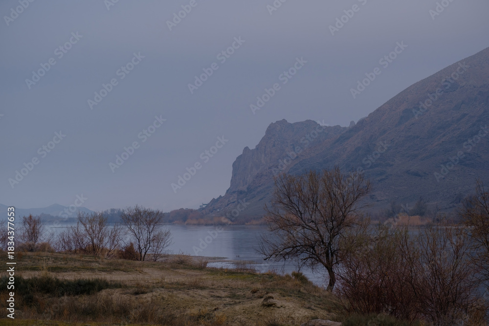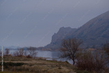 The Ili River. The picture shows an overcast autumn landscape: rocky hills, water and dead vegetation on the shore