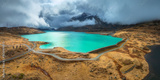 Aerial view of turquoise lake Bianco in the Swiss Alps, rocks and dramatic cloudy sky in autumn in Switzerland. Top drone view of alpine mountains, lake, trail, railroad, dam, orange hills in fall