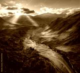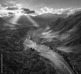 Aerial view of winding mountain road in the Swiss Alps, Switzerland, with sharp curves, golden slopes, valley and dramatic sun rays breaking through clouds over alpine peaks. Top drone view of road