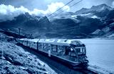 Red modern train is moving along railway in swiss alps near mountain lake on sunny day in autumn in Switzarland. Bernina Express train, orange grass, snowy rocks in clouds, blue sky at sunset in fall